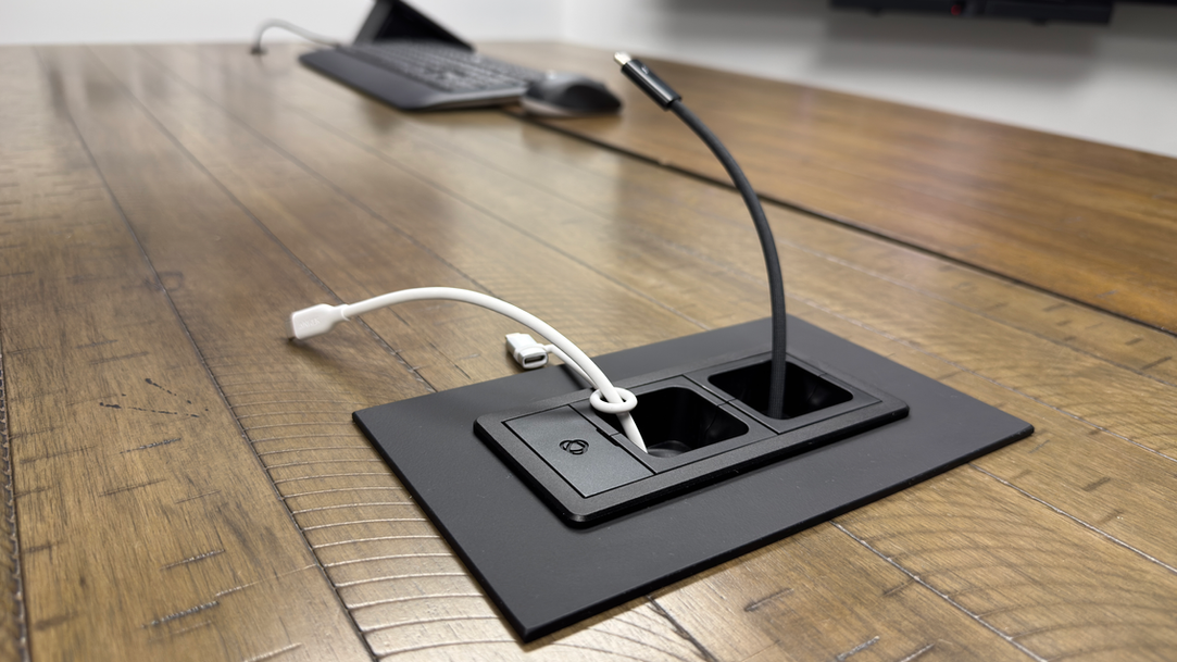 Kramer 2 Module Table Box with USB-C cables passing through for power and connection to the rooms AV peripherals.